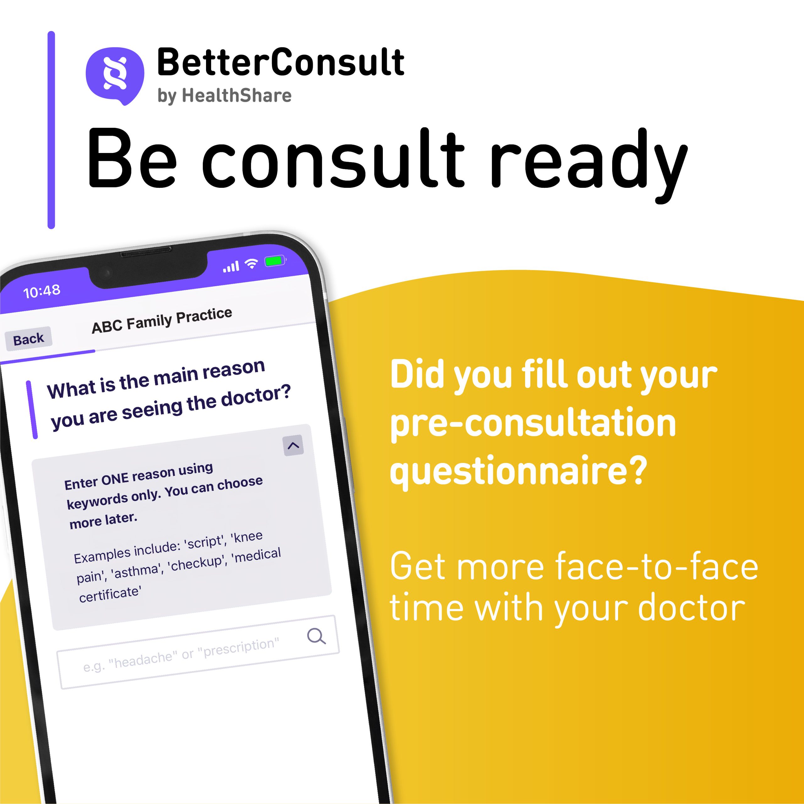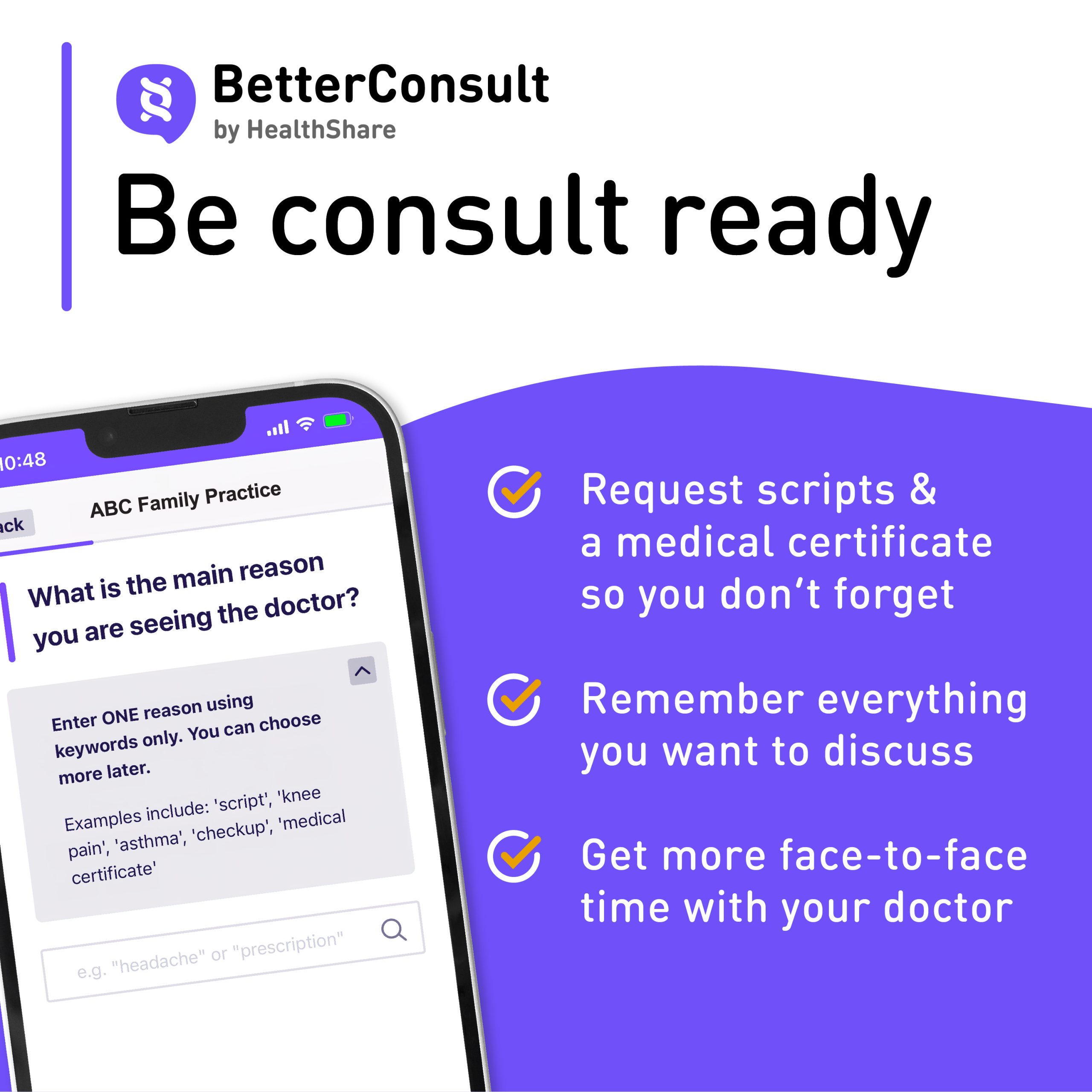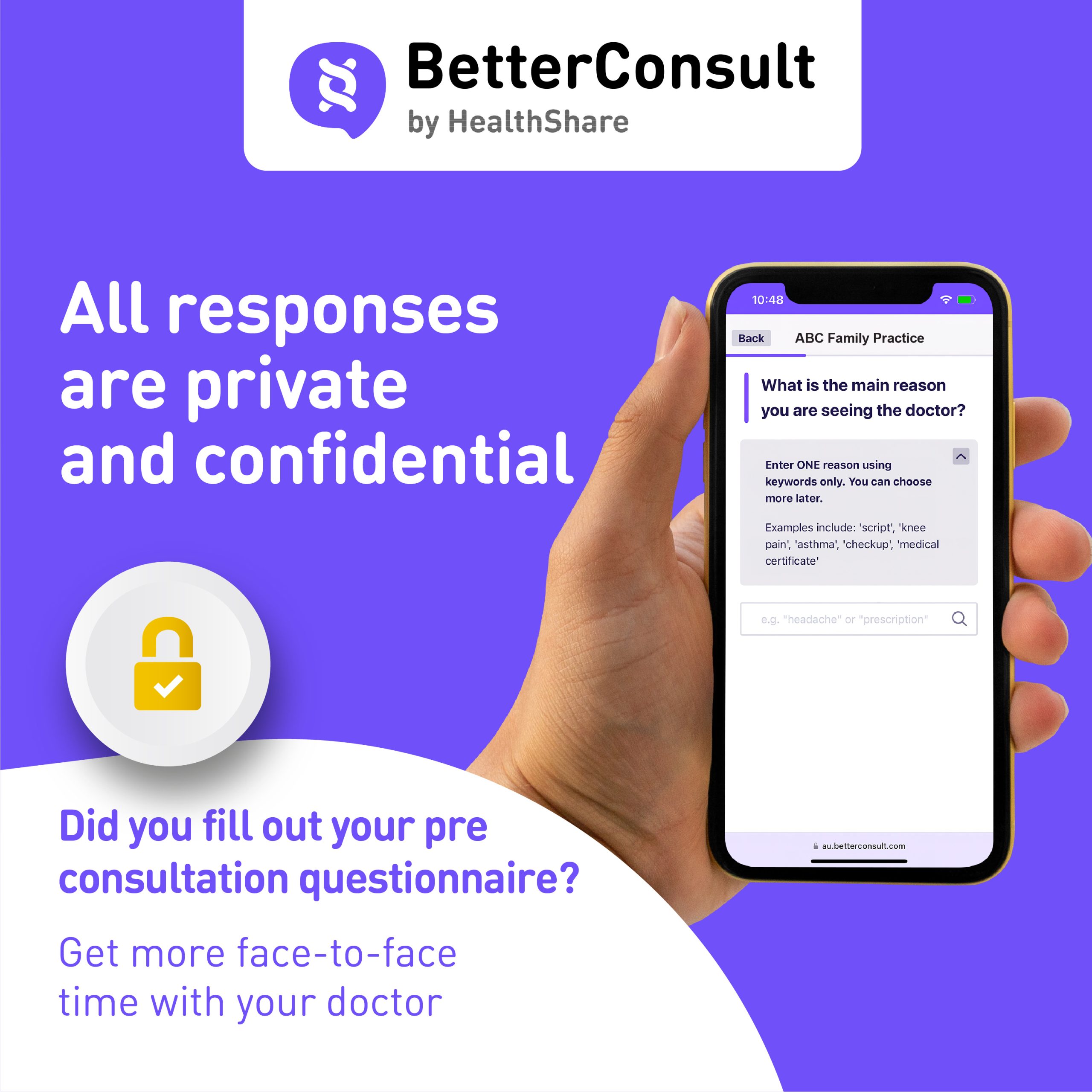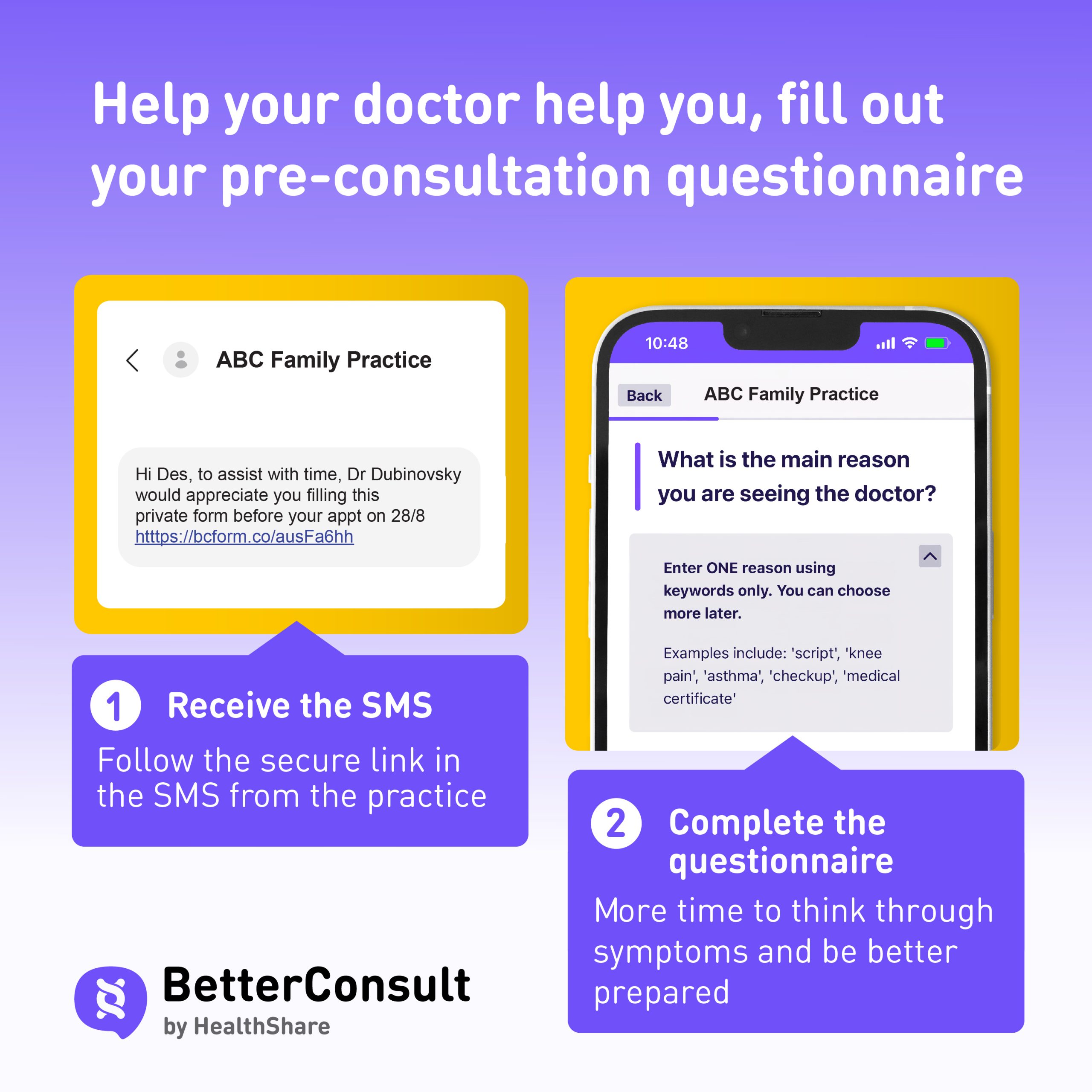 BetterConsult is a “smart” pre-consultation questionnaire that asks the questions your doctor usually asks about the reason for your visit. It then prepares a summary for your doctor.